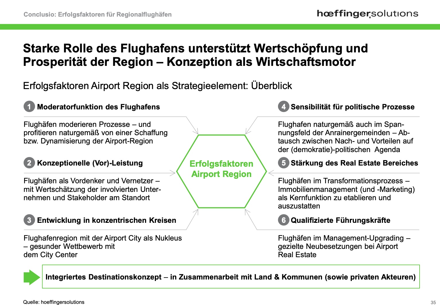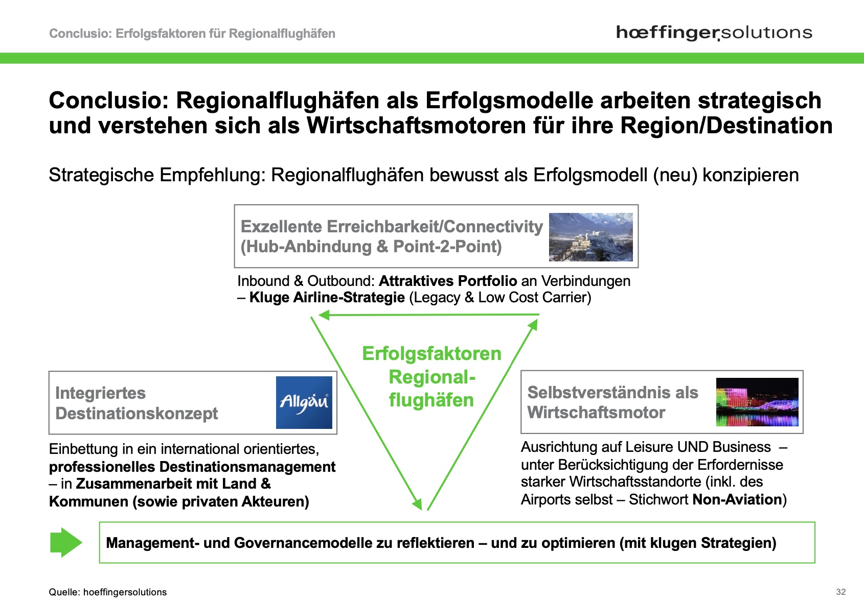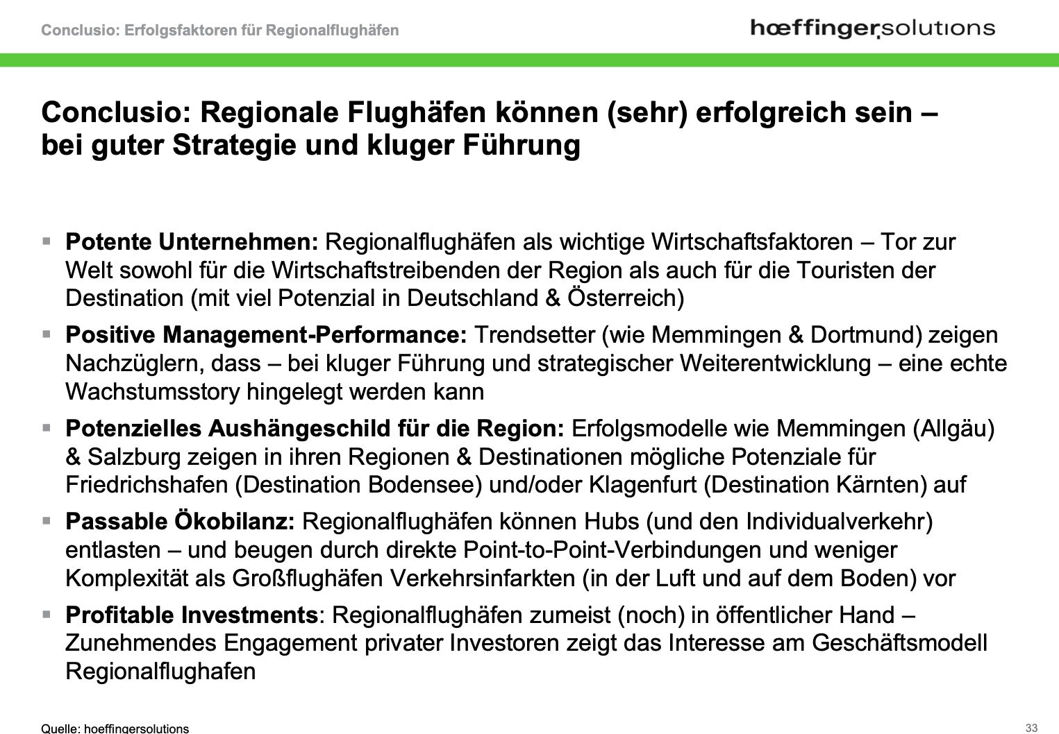 Zentrale Erfolgsfaktoren sind laut unserer Studie eine starke Anbindung an touristisch oder wirtschaftlich attraktive Regionen, moderne Infrastruktur, professionelle Führung und vor allem ein Wille zur Umgestaltung und Neukonzeption. Regionalflughäfen bieten zudem ökologische und wirtschaftliche Chancen: Sie entlasten große Drehkreuze, verringern Reiserouten über den Bodenverkehr und können – bei geeigneter Strategie – zur regionalen Wertschöpfung beitragen. Zahlreiche Unternehmen bewerten laut Studie ihre Standortattraktivität auch anhand der Flughafenanbindung.