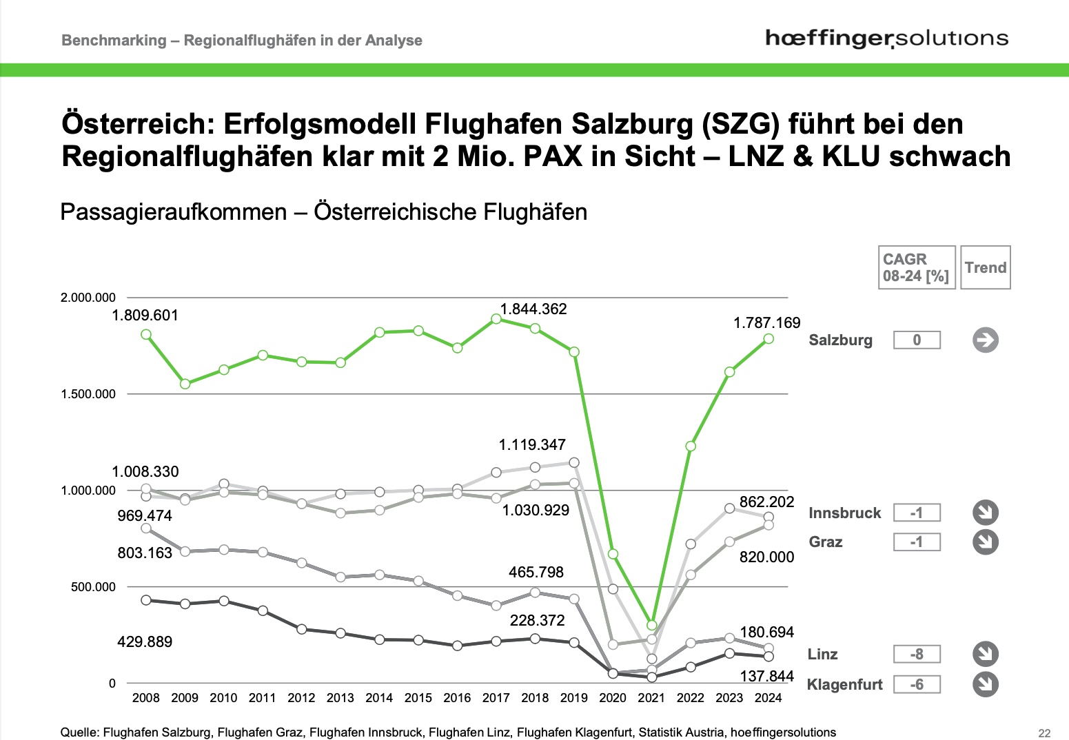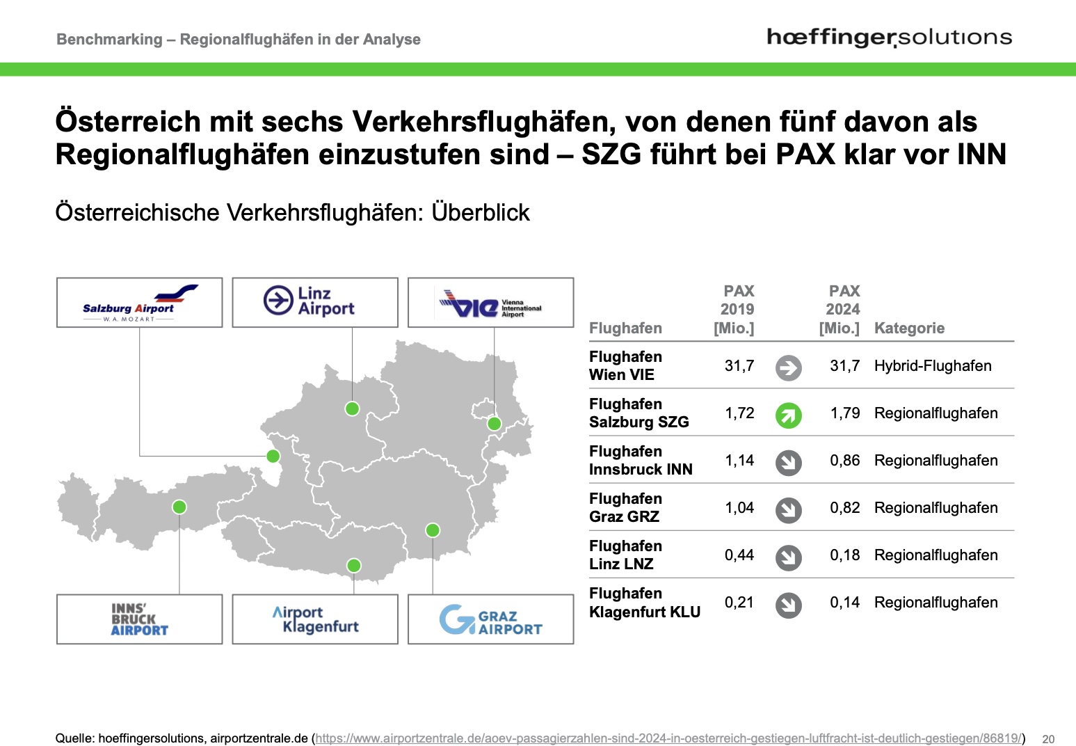 Besonders eindrucksvoll sind dabei die seit 2014 vervierfachte Passagierzahl des Flughafen Memmingens und dem damit einhergehenden Überholen von Dortmund im Jahr 2024. Was dort funktioniert, ist auch in Österreich möglich, wenn die Rahmenbedingungen stimmen. Gerade Linz und Klagenfurt werden in den Medien derzeit kritisch betrachtet. Der Flughafen Linz leidet trotz hoher Frachtkompetenz unter niedrigen Passagierzahlen. In Klagenfurt wurde die Zahl der Verbindungen zuletzt weiter reduziert und der Wettbewerbsdruck durch andere Standorte wächst.